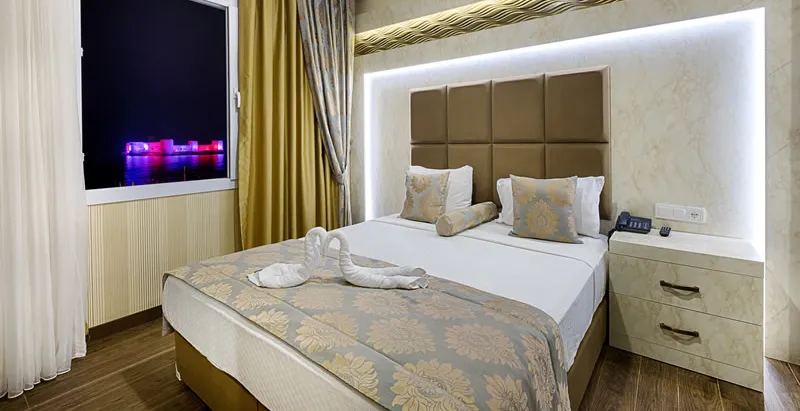 * Kara Manzaralı Standart Oda: 20 m² genişliğindedir. Zemin Laminant parke döşelidir. Odada; Balkon, banyo, çalışma masası, dolap, duş, lcd tv, merkezi klima, müzik yayını, emanet kasa, saç kurutma makinesi, uydu yayını bulunmaktadır. Minibar ücretlidir. Tamamı balkonludur.