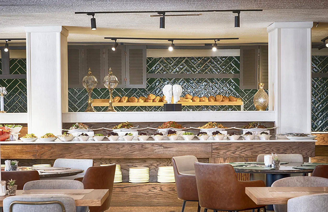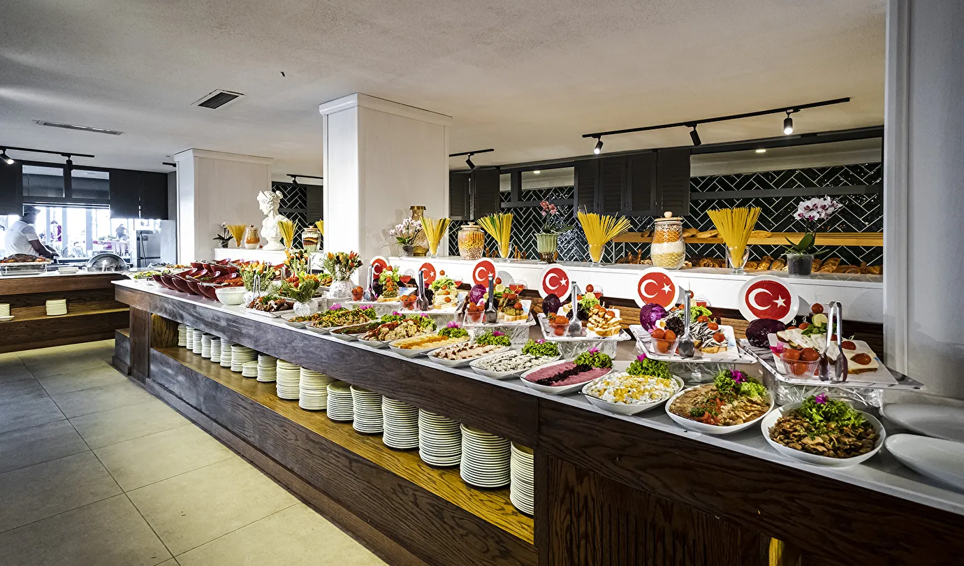 Sabah kahvaltısı, öğle ve akşam yemekleri açık büfe olup, Soft İçecekler (Cola, Fanta, Sprite, Maden Suyu) bardak olarak 10:00 ile 22:00 saatleri arasında ücretsizdir. Çay, su, nescafe, konsantre meyve suları bardak olarak 07:30 ile 22:00 saatleri arasında ücretsizdir.