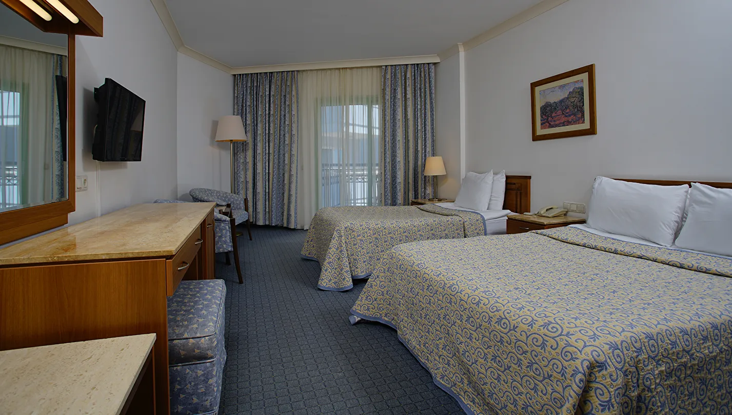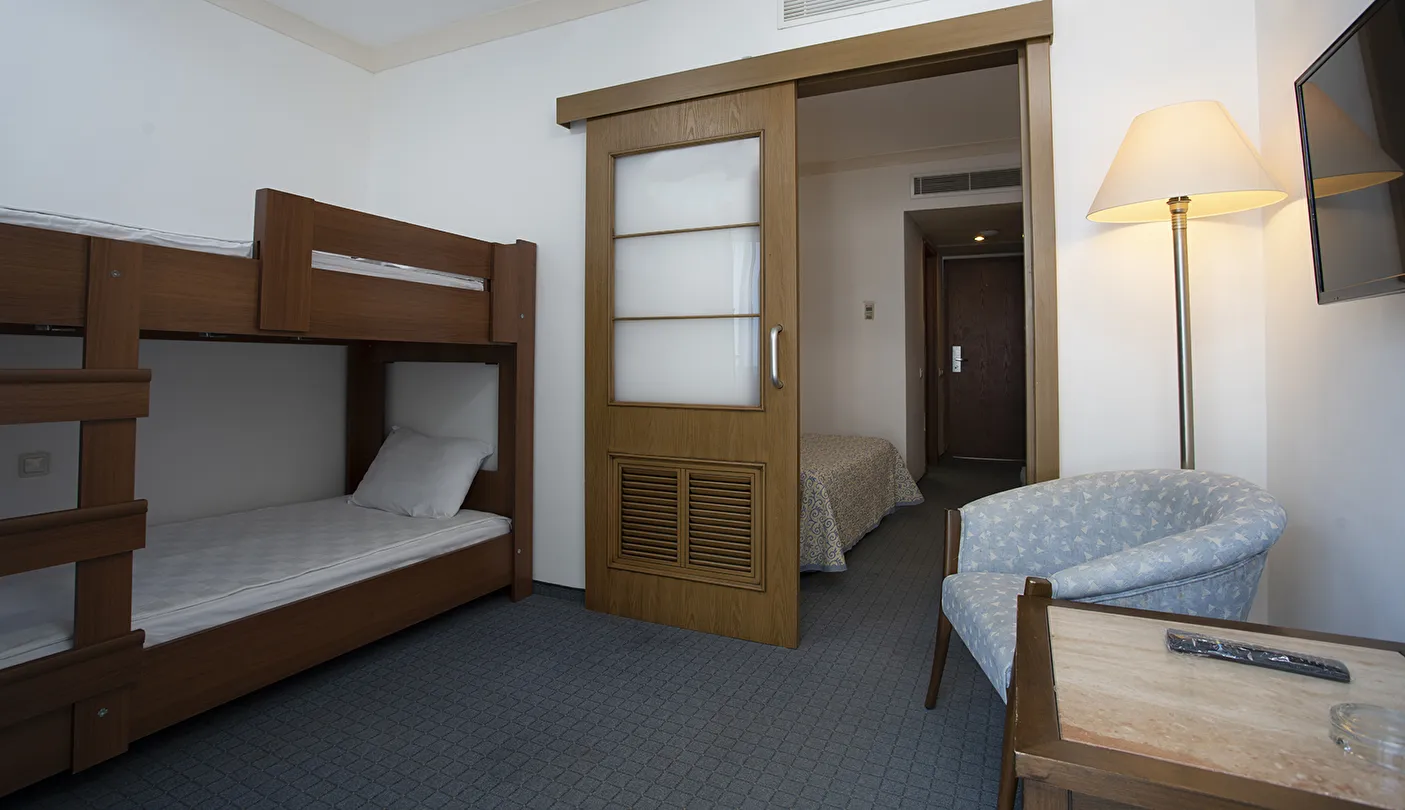 * Aile odası 44 oda Halı zemin 40 m², balkon. 2 ayrı yatak odası ve 1 banyodan oluşmakta olup, 16 tanesi 1 çift kişilik yatak + 1 ranza, 28 tanesi 1 çift kişilik yatak ve 2 tek kişilik odadır. Arada sürgülü kapı mevcuttur. Aile odalarının hepsi kara manzaralıdır.